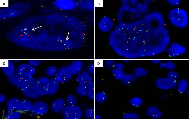 Figure 2: Representative images from ROS1 copy number alterations detected by FISH (ROS1 break-apart probe (spec.orange/green fusion signals) and CEP6 probe (spec.aqua signals). A. ROS1 cluster amplification (arrows) in a nuclei with two copies of CEP6. B. ROS1 amplification with chromosome 6 high polysomy (15 ROS1 and 15 CEP6 copies). C. Polysomic nuclei with 3-4 copies of chromosome 6 and 3-4 copies of ROS1. D. Case showing heterogeneity of ROS1 deletion: nuclei with ROS1 monosomy (1 ROS1 1 CEP6) and nuclei with ROS1 deletion and chromosome 6 disomy (1 ROS1/ 2 CEP6).