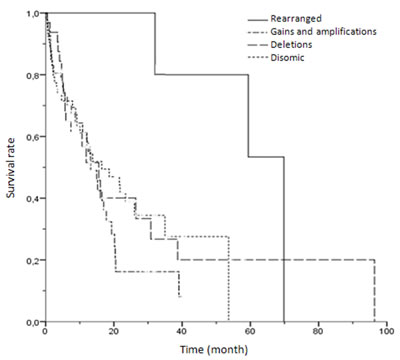 Figure 4: Kaplan-Meier univariate analysis of survival rates among patients with different ROS1 FISH results (rearranged, gains/amplifications, deletions and disomic cases) (p = 0.087).