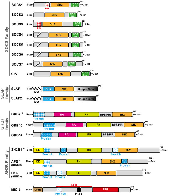 Figure 1: Modular structure of small adaptors that negatively regulate TK signaling. The size of adaptor proteins (number of amino acids), presence of specific homology domains, sequences and myristoylation sites (Myr) are indicated. (*) indicates that the adaptor of this subfamily positively regulates TK signaling.