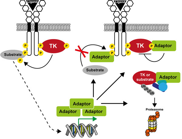 Figure 2: A unifying model on how small adaptors control TK signaling. Sustained receptor stimulation generally induces expression of small adaptor proteins. As a result, the adaptor protein can inhibit TK signaling by competing with effectors/substrates for receptor binding, by directly inhibiting TK activity, or by promoting substrate/TK degradation via its association with a specific ubiquitination factor.