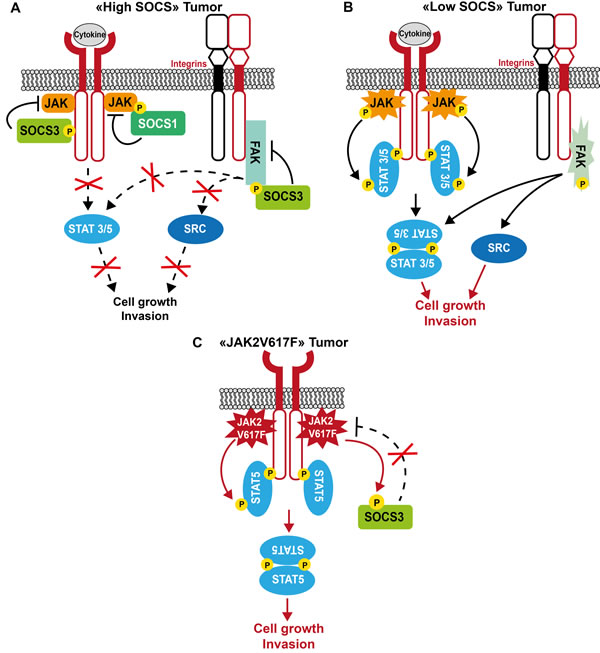 Figure 3: Model of SOCS tumor suppressor function in human cancer. A. In tumor cells with high SOCS expression, these adaptor proteins inhibit tumor cell growth by controlling JAK/STAT-dependent cytokine signaling, and restrict integrin-dependent cell invasion by inhibiting FAK/SRC signaling. B. Upon SOCS inactivation in tumor cells, cytokine and integrin signaling are exacerbated, thus contributing to tumor progression. C. Upon expression of the JAK2V617F oncogene, SOCS inhibitory function is inactivated by tyrosine phosphorylation, which results in increased JAK2V617F oncogenic activity.