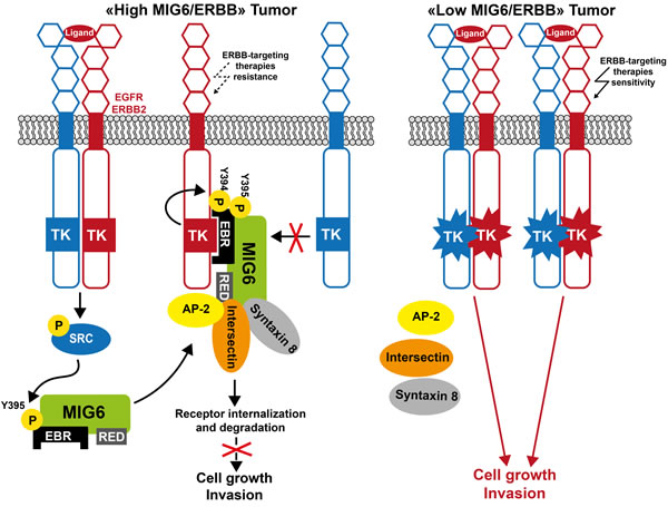 Figure 5: Model of MIG6 tumor suppressor function in human cancer. In tumor cells with a high ratio of MIG6/ERBB receptors, MIG6 inhibits the receptor kinase activity and promotes their internalization for lysosomal degradation, resulting in a dramatic reduction of ERBB oncogenic signaling. In tumor cells with a low MIG6/ERBB ratio, MIG6 activity is reduced and ERBB oncogenic signaling is restored. Consequently, tumor cells may be more sensitive to ERBB-like inhibitors.