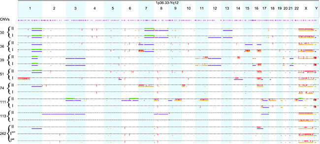 Figure 1: Whole-genome copy number and allelic ratio anomalies in the primary diseases and in their respective paired recurrences. Along the genome, data for CN aberrations as well as AR events are displayed for each sample individually on separate rows. CN aberrations are displayed above the dotted line: CN gains are represented by green marks, CN losses by red marks. Allelic events are displayed below the dotted line: allelic imbalances by purple marks and LOH by dark yellow marks. Regions involved in homozygous copy loss are indicated by thicker red marks. The position of constitutional CNVs is indicated in pink. I: primary tumor; II: recurrent tumor.