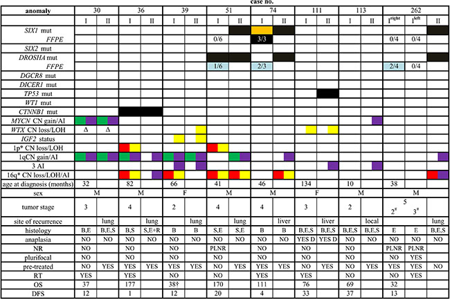 Figure 2: Clinical, pathological and molecular features of the patients investigated. I: primary tumor; II: recurrent tumor (“site of recurrence” indicates the site from which sample II was taken), mut: mutation, the presence of somatic mutation is indicated by a black box, by an orange box when subclonal, and by a light blue box when present only in a few of the investigated specimens (indicated by numbers). Chromosomal anomalies are reported as follows: green, CN gain; red, CN loss; yellow, LOH; purple, allelic imbalance (AI), *anomalies < 1 Mb have not been reported. Δ, deletion of the only present allele. All data but those in the line with “FFPE” (formalin fixed paraffin embedded) tag refer to results obtained on frozen material. M, male; F, female; #local stage; B, blastemal component; E, epithelial component; S, stromal component; R, rhabdomyoblastic elements; D, diffuse anaplasia; NR, nephrogenic rests; PLNR, perilobar nephrogenic rests; RT, radiotherapy; OS, overall survival; DFS, disease-free survival; †dead of disease.