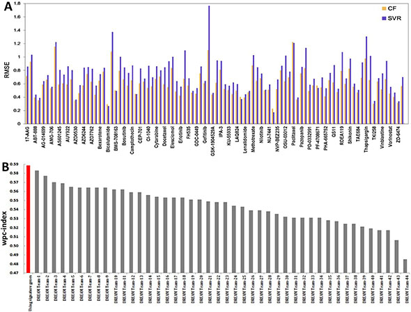 Figure 2: Performance assessment. (A) Performance comparison between SVR and collaborative filtering based drug sensitivity predictions using gene expression profiles. (B) Performance of collaborative filtering based sensitivity predictions compared with the NCI-Dream challenge based on the wpc-index.