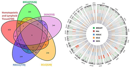 Signature genes of drug sensitivity were derived for five different cancer types respectively using Group Sparse Lasso (Additional file 2): breast cancer (526 genes), hematopoietic and lymphoid cancer (730 genes), small cell lung cancer (SCLC; 520 genes), non small cell lung cancer (NSCLC; 770 genes), and skin cancer (558 genes). As shown in Figure 3, the signature genes selected for the five cancer types were identified to have no specific enrichment distribution in a particular chromosome. In addition, we also found that “Ribosome” was the most significantly enriched pathway for the signature genes of breast cancer, SCLC, NSCLC and skin cancer (Additional File 3). We also noticed that a large proportion of the signature genes were specific to only one of the five cancer types (Figure 3): 38.97% for breast cancer (205 genes), 58.08% for hematopoietic and lymphoid cancer (424 genes), 44.23% for SCLC (230 genes), 46.62% for NSCLC (359 genes), and 43.01% for skin cancer (240 genes). “Complement and coagulation cascades”, “Hematopoietic cell lineage”, “Histidine metabolism”, and “ECM-receptor interaction” are the pathways that were significantly enriched by signature genes specific to breast cancer, hematopoietic and lymphoid cancer, NSCLC and skin cancer respectively, while there were no significantly enriched pathways found for SCLC (Additional File 3). “Complement and coagulation cascades” play an important role in immune response. The complement system as a main column of innate immunity and the coagulation system as a main column in hemostasis undergo massive activation soon after injury. Complement activation could potentially be a very important event in anti-cancer immunity and immunotherapy as it may not only help with tumor clearance but also promote tumor growth [27, 28]. Coagulation disorders are common in neoplastic patients. A hypercoagulable state may be induced when malignant cells interact directly with a hemostatic system and activate the coagulation cascade. Thrombin is formed by the proteolytic cleavage of coagulation factor II in the coagulation cascade and acts, in turn, as a serine protease that converts soluble fibrinogens into insoluble strands of fibrin, and catalyzes many other coagulation-related reactions. It has already been reported that thrombin could support tumor cell malignancy [29]. Ana-Teresa et al. studied 12 candidate genes that are implicated in the etiology of breast cancer and found these genes were functionally involved in the complement and coagulation cascades pathway [30].