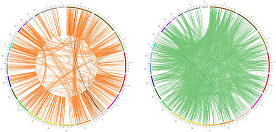 Figure 4: Genomic distribution of synthetic dosage lethality and synthetic lethality. The circle with orange lines represents the SDL pairs, while the one with green lines represents the SL pairs, as documented in the work of Livnat Jerby-Arnon [26]. The black lines were SDL/SL pairs mapped to the targets of the 94 drugs and the related signature genes.