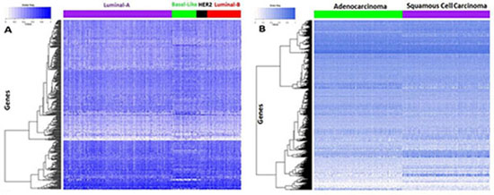 In this study we aimed to investigate the implications of the drug sensitivity related genes identified in the in vitro cell line systems for tumor samples. The gene expression data of tumor samples were retrieved from the TCGA for breast cancer and non-small cell lung cancer (NSCLC), given that other cancer types in our cell line study are not included in the TCGA. The signature genes selected for the two types of cancer cells were separately used to cluster the breast tumor samples and the NSCLC samples. We performed an unsupervised hierarchical cluster analysis for breast tumor samples using signature genes related to drug sensitivity in breast cancer cells. From Figure 5A, one sees that the signature genes showed different expression patterns across the four mRNA-expression subtypes: luminal A, luminal B, HER2E, and basal-like. Similarly, after conducting the unsupervised hierarchical clustering for NSCLC, the expression patterns of the signature genes for NSCLC also revealed obvious differences between adenocarcinoma and squamous cell carcinoma samples (Figure 5B). Generally, different drug treatments are effective for different subtypes of cancer, which implies that patients with different tumor subtypes respond differently to the same medication. This indicated that our selected signature genes derived from cancer cells could be used to classify the tumor patients, and could be extended to predict clinical responses to drug treatments in vivo.