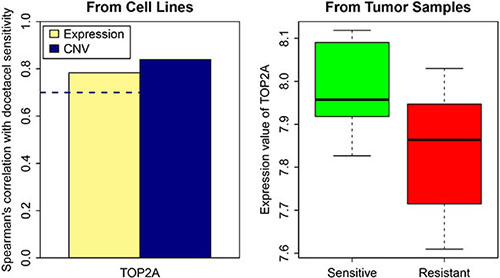 Figure 6: TOP2A gene expression and CNV in resistant and sensitive cell lines as well as in tumor samples. The dash line represents spearman correlation cutoff: 0.7
