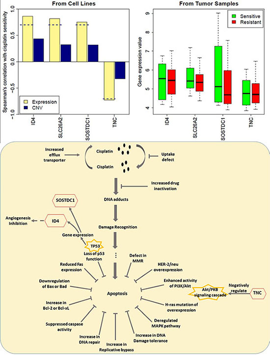 A similar process was performed on the gene expression data from 28 women with stage II or III triple-negative breast cancer (TNBC) [35]. The Miller-Payne scoring system was used to assess tumor responses after four cycles of cisplatin at 75 mg/m2 every 21 days. Four marker genes (ID4, SOSTDC1, SLC26A2, TNC) relevant to drug activity to cisplatin on breast cancer cells were derived from the signature genes for breast cancers (Figure 7). Upregulated ID4, SOSTDC1, SLC26A2 and downregulated TNC may play a role in regulating drug resistance. Among the genes presented, we found that TNC were involved in cell adhesion and cell communication which has been linked to cisplatin-induced cell death [36]. The mechanisms responsible for cisplatin resistance were only reported sporadically, which included the loss of p53 function, overexpression of HER2/neu, activation of the PI3K/AKT pathway etc [37]. The indicator role of SOSTDC1, ID4 and TNC for cisplatin resistance may lie in the loss of p53 function and the activation of the PI3K/Akt pathway. We were the first group to summarize the potential role of SOSTDC1, ID4 and TNC in cisplatin-resistance, as shown in (Figure 7B). It can be seen that the gene expression of SOSTDC1 and ID4 is regulated via the TP53 pathway in breast cancer [38–41], and that ID4 may influence the expression of proangiogenic cytokines, such as IL8 and GRO-alpha, increasing the angiogenic potential of cancer cells [39]. [43, 44] Besides, TNC was found to be a negative regulator of the AKT/PKB signal transduction pathway [42]. However, the role of SLC26A2 in cisplatin resistance is still unclear. Given that these genes showed accordant trends of change in gene expression values in the TNBC patients as in the breast cancer cells (Figure 7), they may also be relevant to cisplatin resistance in TNBC patients.