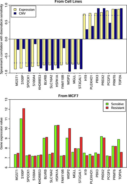 Doxorubicin is a naturally occurring anthracycline antibiotic that is broadly considered the most active single agent available for the treatment of breast cancer [43]. On the other hand, cancer drug resistance limits its use, and ABCB1(MDR1, P-gp), ABCC1 (MRP1) as well as other transporters have been characterized in previous studies for their roles in drug resistance [44]. In our study, 19 genes were identified as potential markers associated with primary resistance to doxorubicin in breast cancer cells (Figure 8). Among the 19 genes, TOP2A showed a higher expression value and higher CNV values in breast cancer cells sensitive to doxorubicin than those in the resistant cells, while S100P and S100A4 showed lower expression values and lower CNV values in the sensitive cells than those in the resistant ones. Doxorubicin induces cancer cell death by many mechanisms, the most notable is Top2A poisoning, and also the down-regulation of Top2A is obviously detected in doxorubicin resistant MCF7 cells [45]. Overexpression of S100P and S100A4 has been described in doxorubicin-resistant cell lines [46, 47]. BLVRB, MGST1 and H19 have been linked to multidrug resistance, including resistance to doxorubicin [48–50]. H19 has been found to increase cellular doxorubicin accumulation levels via suppressing MDR1/P-glycoprotein expression which is important in decreasing doxorubicin accumulation levels [50]. Additionally, ST3GAL1 encodes asialytransferase which participates in the sialylation that is associated with doxorubicin resistance [51]. A possible mechanism responsible for sialytransferase -related doxorubicin resistance may be due to the PI3K/AKT signaling pathway. The manipulation of the sialytransferase genes’ expression modulated the activity of the PI3K/AKT signaling pathway and its downstream target, thus regulating the proportionally mutative expression of P-glycoprotein (P-gp) and MDR-related protein 1 (MRP1) [51]. PRMT6 may also relate to the PI3K/AKT mechanism via PTEN. PTEN is a tumor suppressor gene that inhibits the PI3K pathway, and lower PRMT6 expression may result in increased PTEN expression, decreased cell cycle progression and increased breast cancer cell apoptosis [52].