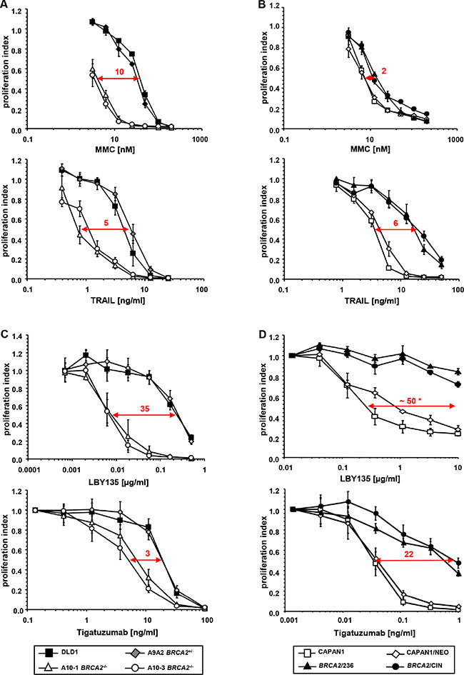 Figure 1: Genetic BRCA2 inactivation enhances the sensitivity of cancer cells towards TRAIL-R-mediated apoptosis. (A) Proliferation assays of BRCA2-proficient DLD1 and corresponding BRCA2+/− A9A2 cells versus two corresponding homozygously BRCA2-deleted clones (A10-1 BRCA2−/− and A10-3 BRCA2−/−) after treatment with the indicated agents. (B) Confirmatory proliferation assays of BRCA2-deficient parental (CAPAN1) and empty vector-transfected (CAPAN1/NEO) pancreatic cancer cells versus two BRCA2-complemented cell clones CAPAN1/CIN and CAPAN1/236 after treatment with the indicated agents. All experiments were performed in triplicate with error bars representing SEM from three independent experiments. * = extrapolated value. (C, D) Effects of BRCA2-status on cell viability upon administration of the clinically viable TRAIL-R2-targeting agonistic antibodies LBY-135 and tigatuzumab in BRCA2-proficient and BRCA2-deficient DLD1 cells (C) and in BRCA2-proficient and BRCA2-deficient CAPAN1 cells (D).