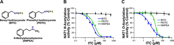 Figure 1: Dose-dependent inhibition of NAT1 activity by the aralkyl isothiocyanates benzyl isothiocyanate (BITC) and phenetyl isothiocyanate (PEITC). (A) Chemical structures of the ITCs (BITC and PEITC) and N-methylphenethylamine (NMPEA), a non-ITC analog of PEITC. (B and C) Effect of BITC, PEITC and NMPEA on NAT1 activity. NAT1 enzyme (1 μM) was incubated with increasing concentrations of BITC, PEITC and NMEPA for 30 min at 37°C. Residual NAT1 N-acetylation (B) and O-acetylation activities (C) were measured using p-aminobenzoic acid (pABA) and N-hydroxy-4-aminobiphenyl (N-OH-4-ABP) as AA substrates, respectively. Error bars indicate S.D. values. Results are presented as percent control NAT1 activity.