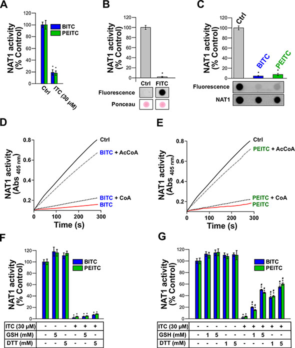 Figure 2: Irreversible inhibition of NAT1 by BITC and PEITC through covalent modification of NAT1 active-site catalytic cysteine. (A) Effect of dialysis on the inhibition of NAT1 activity by BITC and PEITC. NAT1 enzyme (1 μM) was first incubated with BITC or PEITC (30 μM) for 30 min at 37°C. Samples were dialyzed overnight prior to residual NAT1 activity measurement. Error bars indicate S.D. values. Results are presented as percent control NAT1 activity. *p < 0.05 compared with NAT1 activity in the control. (B) ITC-coupled fluorescein (FITC) inhibits NAT1 activity and covalently binds to the enzyme. NAT1 enzyme (1 μM) was incubated with FITC (30 μM) for 30 min at 37°C and residual NAT1 activity measured. Error bars indicate S.D. values. Results are presented as percent control NAT1 activity. *p < 0.05 compared with NAT1 activity in the control. In parallel, samples were spotted on nitrocellulose membranes and FITC adducts determined by fluorescence. Membranes were also stained with Ponceau red. (C) Modification of NAT1 cysteines by BITC and PEITC. NAT1 (1 μM) enzyme was first incubated with BITC or PEITC (30 μM) and then incubated with 20 μM 5-(iodoacetamido)fluorescein (5-IAF) for 10 min at 37°C. Error bars indicate S.D. values. Results are presented as percent control NAT1 activity. *p < 0.05 compared with NAT1 activity in the controls. Samples were spotted on nitrocellulose membranes and 5-IAF labeling of NAT1 cysteine residues was determined by fluorescence. Membranes were also probed with an anti-NAT1 antibody. (D, E) Active-site protection assay using acetyl-coenzyme A (AcCoA) or coenzyme A (CoA). NAT1 enzyme (1 μM) was incubated with BITC (E) or PEITC. (F) (30 μM) in presence of an excess concentration (150 μM) of AcCoA or CoA. Progress curves for residual NAT1 activity (absorbance at 405 nm) are shown. (F) Effect of reduced glutathione (GSH) or dithiothreitol (DTT) on the inhibition of NAT1 activity by BITC and PEITC. NAT1 enzyme (1 μM) was first incubated with BITC or PEITC (30 μM) for 30 min at 37°C. Samples were further incubated for 30 min with reducing agents (5 mM DTT or 5 mM GSH) prior to residual NAT1 activity measurement. Error bars indicate S.D. values. Results are presented as percent control NAT1 activity. *p < 0.05 compared with NAT1 activity in the control. (G) GSH and DTT fail to fully protect NAT1 from inhibition by ITCs. NAT1 enzyme (1 μM) was preincubated with BITC or PEITC (30 μM) in the presence of high concentrations (> 160 times the concentration of BITC or PEITC) of GSH or DTT prior to residual activity measurement. Error bars indicate S.D. values. Results are presented as percent control NAT1 activity. *p < 0.05 compared with NAT1 activity in the controls. #p < 0.05 compared with BITC or PEITC-inhibited NAT1.