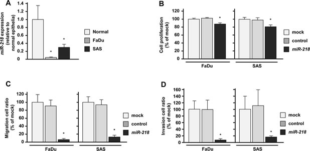 Figure 1: Effects of miR-218 transfection on HNSCC cell lines, FaDu and SAS. (A)Real-time RT-PCR showed that expression levels of miR-218 was significantly lower in both cell lines, FaDu and SAS than in normal epithelial specimens. (B)Suppression of FaDu and SAS cell proliferation after transfection (72h) with miR-218 (10nM) was determined by XTT assay. (C) Suppression of FaDu and SAS cell migration activity after transfection (72h) with miR-218 (10nM) was determined by migration assay. (D) Suppression of FaDu and SAS cell invasion activity after transfection (72h) with miR-218 (10nM) was determined by Matrigel invasion assay. *p < 0.0167.