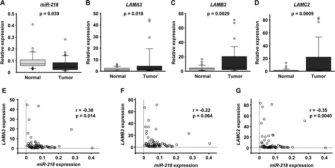 Laminin-332, a heterotrimer composed of three chains (LAMA3, LAMB3 and LAMC2), is an adhesion substrate for epithelial cells, and regulates epithelial cell migration during epithelial regeneration and repair processes [35, 36]. Several immunohistochemical studies have shown that laminin-332 or its subunit LAMC2 is expressed in tumor cells at the invasion front or in budding tumor cells in many types of human cancers such as adenocarcinomas of colon, breast, pancreas and lung and SCC of esophagus, and melanoma [35]. Therefore, one of the chains, LAMC2 is a specific marker for invasive tumors [37]. The beta-catenin (Wnt) signaling pathway is known to induce a coordinate expression of laminin-332-LAMC2 chain and MT1-MMP in colorectal carcinomas [38]. In this study, LAMC2 was upregulated in cancer tissues and confirmed previous reports. Although there is no putative miR-218 target site in LAMC2 gene, silencing of LAMC2 mRNA expression was observed in miR-218 transfectants. Because LAMC2 was also downregulated in the expression profile of si-LAMB3 transfectants, it is assumed that the downregulation of LAMB3 somehow suppresses LAMC2 expression. The analysis of the molecular mechanism of downregulation of LAMC2 by miR-218 is needed.