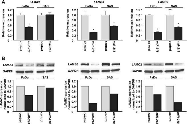 The following RNA species were used in this study: mature miRNA, Pre-miRTM miRNA Precursor (hsa-miR-218; Applied Biosystems, USA, P/N: AM17100), negative control miRNA (Applied Biosystems, P/N: AM17111), small interfering RNA (Silencer Select, Applied Biosystems, si-LAMB3, P/N: s8075 and s8076) and negative control siRNA (Stealth™ RNAi Negative Control Medium GC Duplex, Invitrogen, P/N:12935-300). miRNAs were incubated with Opti-MEM (Invitrogen) and LipofectamineTM RNAiMax Reagent (Invitrogen) as described previously [12]. Transfection efficiency of Pre-miRTM in cell lines was confirmed based on downregulation of TWF1 (PTK9) mRNA following transfection with miR-1 as previously reported [9, 31].