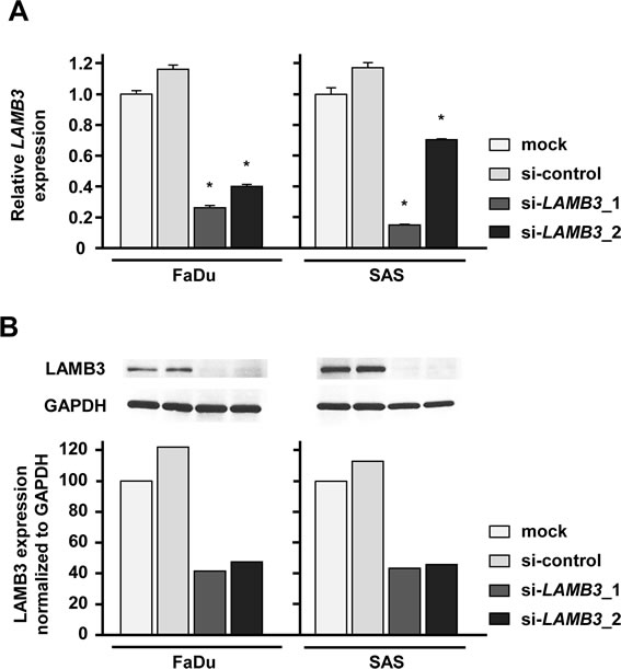 Cells were harvested and lysed 48 h after transfection. Each cell lysate (50 μg of protein) was separated using Mini-PROTEAN TGX gels (Bio-Rad, USA) and transferred to PVDF membranes. Immunoblotting was performed with polynoclonal LAMA3 antibody (sc-20143; Santa Cruz, USA), polyclonal LAMB3 antibody (HPA008069; Sigma-Aldrich, USA) and monoclonal LAMC2 antibody (MAB19562; Millipore, USA). GAPDH antibody (ab8245; Abcam, UK) was used as an internal control. The membrane was washed and incubated with anti-rabbit IgG, HRP linked antibody or anti- mouse IgG, HRP linked antibody (#7074 and #7076; Cell Signaling Technology, USA). Complexes were visualized with an Immun-StarTM WesternC Chemiluminescence Kit (Bio-Rad), and the expression levels of these proteins were evaluated by ImageJ software (ver.1.44; http://rsbweb.nih.gov/ij/index.html).
