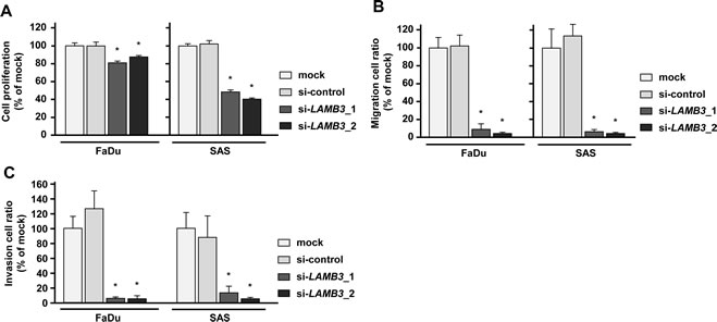 Furthermore, we asked why LAMB3 has an oncogenic function in HNSCC. We conducted gene expression analysis using si-LAMB3 to monitor LAMB3-controlled genes. In this study, several integrin signaling downstream molecules (JUN, RAC1 and PXN) were downregulated in the expression profile of si-LAMB3 transfectants. Many studies indicated that laminin-332 binds to several cell-surface receptors, such as integrins, epidermal growth factor receptor and syndecan-1 [39-41]. Among them, the integrins are cell surface transmembrane proteins that mediate the extracellular signals and the intracellular pathways leading to cell cycle controlling, cell migration and invasion of cancer cells [42].