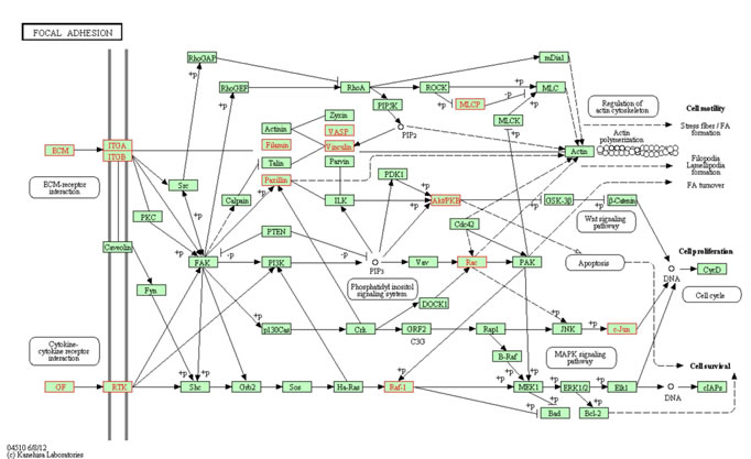 Figure 7: Putative LAMB3 regulated genes in “focal adhesion pathway”. Putative LAMB3 regulated genes in “focal adhesion pathway” from Kyoto Encyclopedia of Genes and Genomes (KEGG). The putative LAMB3 regulated genes (highlighted in red) as defined by KEGG pathway and determined through GENECODIS analysis.