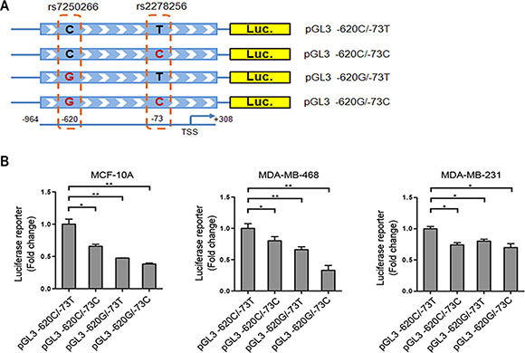 Figure 2: rs7250266 and rs2278256 reduce NBA1 promoter activity. (A) Illustration of luciferase reporter constructs containing rs7250266 or rs2278256. DNA fragment of NBA1 promoter region (−964 to +308 bp, the transcriptional start site is determined as +1) containing rs7250266 (C > G), rs2278256 (T > C) or both was cloned into pGL3 luciferase vector respectively. (B) Luciferase reporter assay of cells expressing constructs containing different alleles of rs7250266 and rs2278256. MCF-10A, MDA-MB-468 or MDA-MB-231 cells were transiently transfected with luciferase reporter constructs as illustrated and the internal pRL-CMV control plasmid. Luciferase activity from cells carrying constructs containing the C-allele of rs7250266 and T-allele of rs2278256 (pGL3 -620C/-73T) were set to “1” and used for control for comparison. Fold change was calculated by comparing luciferase activity from cells expressing other alleles of rs7250266 and rs2278256 to cells expressing pGL3 -620C/-73T. Data represent mean values, with error bars indicating S.E.M. (standard error of the mean). Statistical data were analyzed by the t test (*P < 0.05; **P < 0.01). Experiments have been repeated three times for each cell line and similar results were obtained.