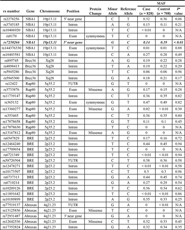 We carried out a systematic analysis of 37 genetic variants in genes from the BRCA1 associated A complex including ABRAXAS, BRCC36, RAP80 BRE and NBA1, in a Chinese Han Women cohort, including 414 triple-negative breast cancer (TNBC) cases and 354 controls. The criteria for selected polymorphisms are described in “Materials and Methods” section. As shown in Supplementary Table S2, the patients’ clinical characteristics in this study revealed that the TNBC cases were significantly more likely to be at menarche at younger age than the controls. We assessed their associations with TNBC using genotype data from SEQUENOM MassARRAY platform (Table 1). We observed no significant deviation from Hardy–Weinberg equilibrium of each polymorphism either in controls or in cases with a cut-off value of 0.05. All polymorphisms were genotyped successfully with genotyping call rate ranging from 95 to 100%.