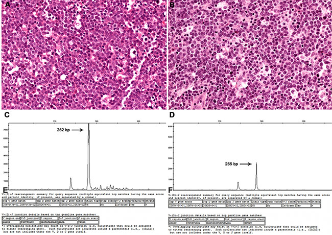 Figure 1: Representative case (#4). Histopathology sections of a lymph node diagnosed as a DLBCL in both 2002 (A) and 2004 (B). Using GeneMapper analysis, a peak at 252 bp was seen in the primary DLBCL (C), whereas a peak at 255 bp appeared in the relapsed DLBCL (D). In sequencing analysis, both tumors showed identical VH, DH, and JH gene segments and junctions (E and F).