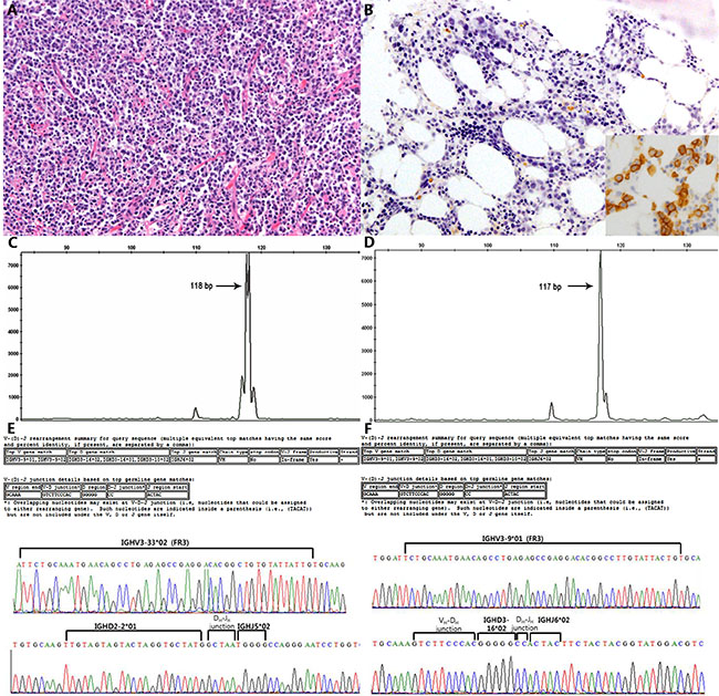 Figure 3: Representative case (#17) of an unrelated relapse from a DLBCL to a DLBCL. (A and B) Different IGH fragment lengths (difference of one base pair) were found in the GeneMapper analysis (C and D), and different VH, DH, and JH gene segments and junctions were found by sequencing (E and F).