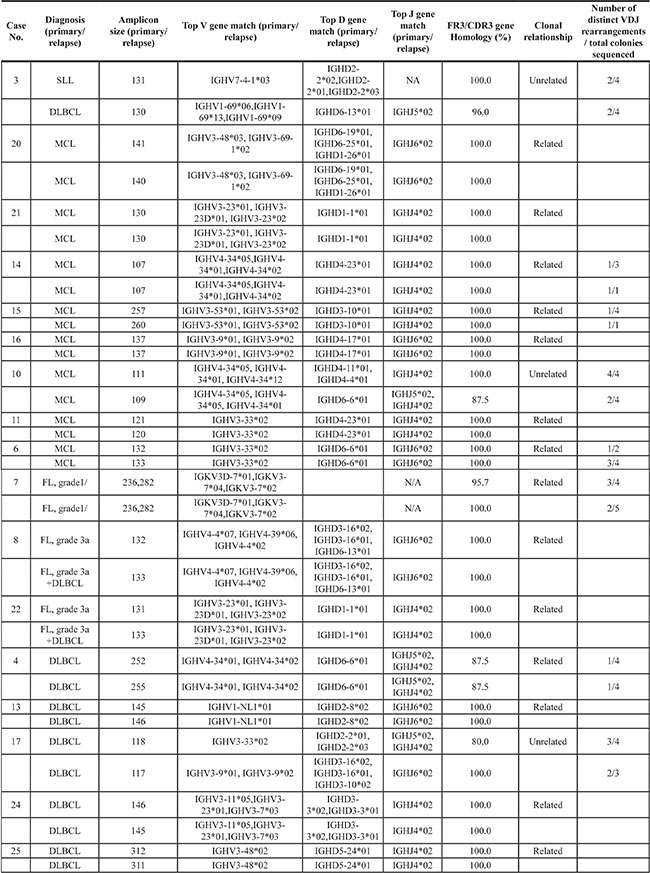 Examination of the Ig rearrangements in primary and corresponding relapsed tumors yielded the same-sized PCR products in eight cases. To investigate this further, we performed cloning and sequencing of the PCR products in 19 cases that showed strong bands in gel electrophoresis. The BIOMED-2 PCR products covering the junctions at IgVH FR1–VDJ, IgVH FR2–VDJ, IgVH FR3–VDJ, and Ig VK–VDJ were analyzed in one, two, 13, and one pair, respectively. In 17/19 patients, the IgH or IgK gene could be sequenced successfully for both primary and corresponding relapsed tumors. Pairs for two of the patients (cases #26 and #27) could not be sequenced because the DNA was of insufficient quantity or quality for analysis.