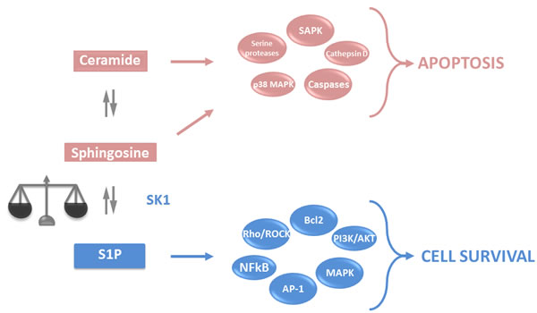 Figure 1: Sphingolipid rheostat. Ceramide and sphingosine are intracellular lipid second messengers, which induce activation of apoptotic pathways. In turn, SK1 can phosphorylate sphingosine to yield S1P, a lipid second messenger that activates anti-apoptotic pathways and antagonises the effects of ceramide and sphingosine. The intracellular balance between ceramide, sphingosine and S1P determines the cell fate. PKC - protein kinase C; MAPK - mitogen-activated protein kinases; JNK - c-Jun N-terminal kinases; SAPK - stress activated protein kinase; NFkB - nuclear factor kappa B; PLC - phospholipase C; Bcl2 - B cell lymphoma 2, AP-1 - activator protein 1 (reviewed in [248] and [249]).