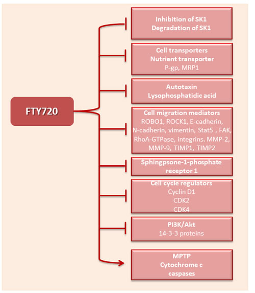 Some report propose that FTY720’s anti-cancer activity may be due to its ability to induce nutrient transporter down-regulation [231] or inhibition of P-glycoprotein (P-gp) and multidrug resistance protein [174].