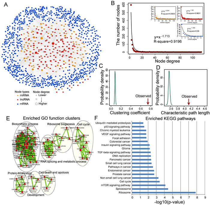 Figure 1: Ovarian cancer-specific lncRNA-associated ceRNA network and their characteristics. A. Global view of the LCeNET in ovarian cancer. This network consists of 1045 nodes and 2516 links. B. Degree distribution of the LCeNET. C. The clustering coefficient of the LCeNET is higher than randomization test. The arrow represents the clustering coefficient in the real network. D. The characteristic path length of the LCeNET is higher than randomization test. The arrow represents the characteristic path length in the real network. E. The functional enrichment map of GO terms. Each node represents a GO term, which are grouped and annotated by GO similarity. A link represents the overlap of shared genes between connecting GO terms. Node size represents the number of gene in the GO terms. Color intensity is proportional to enrichment significance. F. Significantly enriched KEGG pathway of mRNAs in the LCeNET.