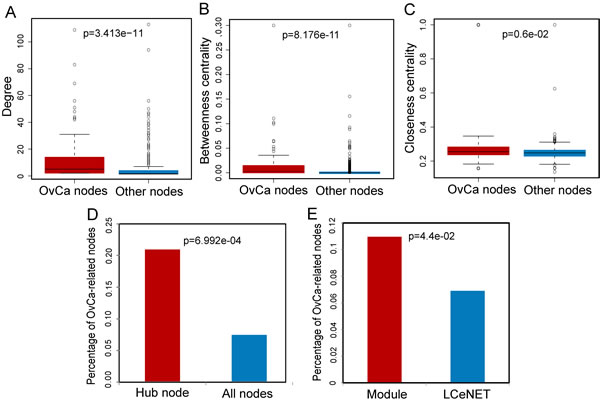 Figure 2: The ovarian cancer-associated nodes tend to be hubs and are enriched in modules. A. The difference of degree between ovarian cancer-associated nodes and other nodes. Ovarian cancer-associated nodes had a higher degree than other nodes. B. The difference of betweenness centrality between ovarian cancer-associated nodes and other nodes. Ovarian cancer-associated nodes had a higher betweenness centrality than other nodes. C. The difference of clustering coefficient between ovarian cancer-associated nodes and other nodes. Ovarian cancer-associated nodes had a higher clustering coefficient than other nodes. P-values were calculated based on Wilcoxon rank sum test. D. The proportion of ovarian cancer-associated nodes among hubs and all nodes in the LCeNET. E. The proportion of ovarian cancer-associated nodes among modules and LCeNET. P-values were calculated based on Hypergeometric test.