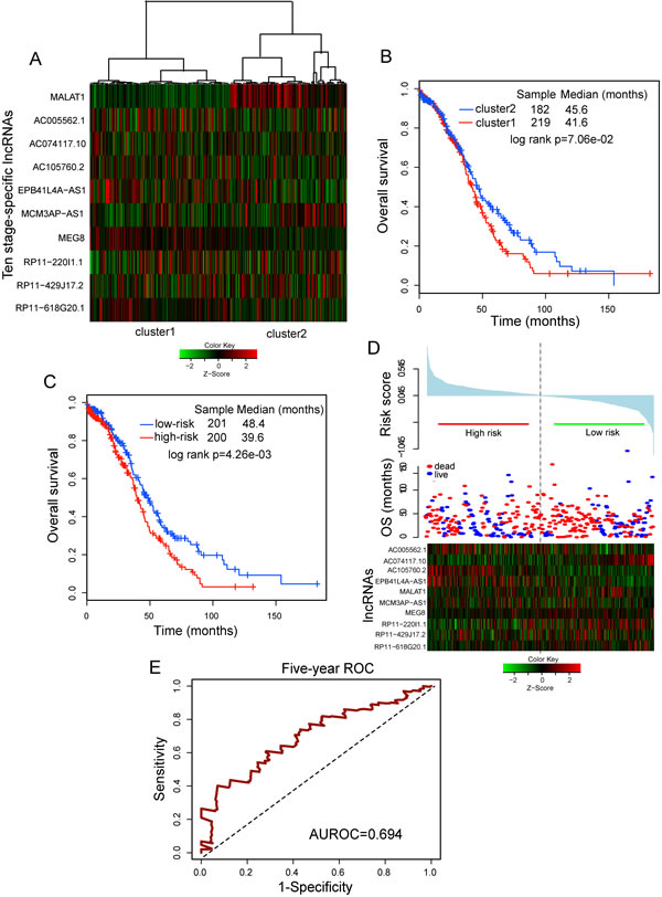 Figure 3: Prognostic value of ten-lncRNA signature for assessing clinical outcome of ovarian cancer. A. Hierarchical clustering heatmap and dendrogram of ovarian cancer samples based the expression patterns of ten stage-specific HublncRs. B. Kaplan-Meier survival curves for ovarian cancer samples classified into two subgroups using the unsupervised hierarchical clustering strategy. P-Values were calculated using the log-rank test. C. Kaplan-Meier survival curves for ovarian cancer samples classified into high-risk and low-risk groups using the ten-lncRNA signature. P-values were calculated using the log-rank test. D. The ten lncRNA-based risk score distribution, patients’ survival status and heatmap of the ten stage-specific HublncRs expression profiles. The black dotted line represents the cutoff value of the risk score derived from the TCGA patients which separated patients into high- and low-risk groups. E. Receiver operating characteristic (ROC) analysis of the risk scores for overall survival prediction in the TCGA dataset.