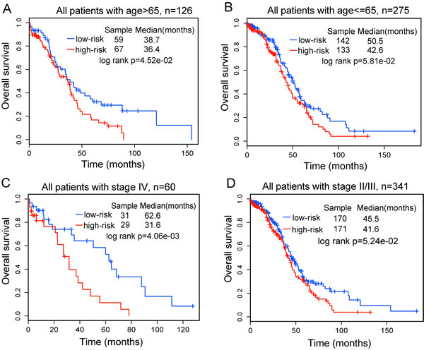 We further investigated whether the prognostic value of the ten-HublncR signature was independent of other clinical variables. For this, we first performed multivariate Cox regression analysis including ten-HublncR risk score, age, grade, stage and surgical debulking status as covariates. The results showed that ten-HublncR risk score (HR = 2.485, p = 0.004), age (HR = 1.018, p = 0.007) and stage IV (HR = 2.666, p = 0.044) were independent prognostic factors (Table 2). Next, data stratification analysis was then performed for age and stage. All patients of TCGA dataset were stratified by age into either an elder stratum (age > 65) or a younger stratum (age≤65). This stratified analysis showed effective prognostic power of the ten-HublncR signature in both the younger and elder patient groups. The ten-HublncR signature could classify patients within each age stratum into either high- or low-risk groups with significantly different OS (median OS 36.4 months vs. 38.7 months, log-rank test p = 0.045 for the elder patient group and median OS 42.6 months vs. 50.5 months, log-rank test p = 0.058 for the younger patient group) (Figure 4A and 4B), indicating that the prognostic power of ten-HublncR signature was also age-independent. Then the patients of stage II-III and stage IV for TCGA dataset were classified into two separate groups. The stratified analysis was further performed in patients group with stage II-III and patients with stage IV to evaluate whether the ten-HublncR signature could predict OS of patients for different clinical stage. The results of stratification analysis showed that the ten-HublncR signature could further subdivide patients with stage IV into either a high-risk group with shorter survival or a low-risk group with longer survival (median OS 31.6 months vs. 62.6 months, log-rank test p = 0.004) (Figure 4C). Difference for OS between high-risk group (n = 171) and low-risk group (n = 170) was also observed in patients with stage II-III (median OS 41.6 months vs.45.5 months) (Figure 4D), although the log-rank p value is 0.052 which was slightly above the 0.05 significance level.