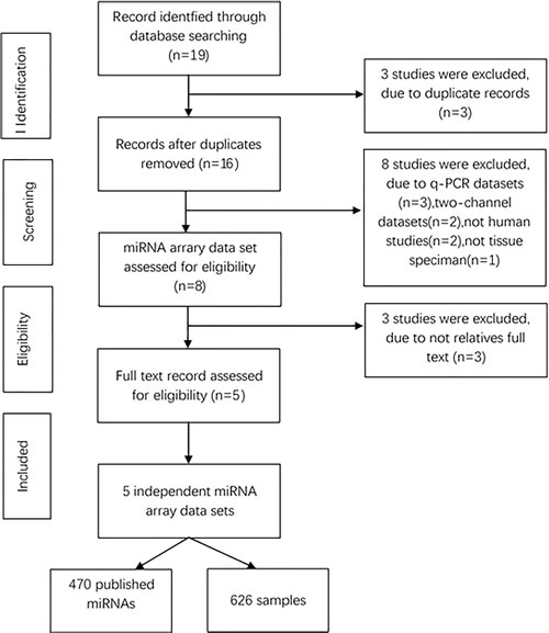 Microarray data sets were extracted from NCBI and Gene Expression Omnibus by means of the MESH terms ‘lung cancer/lung neoplasm/NSCLC’ and ‘microRNAs/miRNA’, in combination with the keyword ‘lung tumor/lung neoplasm/NSCLC’ and ‘gene expression/target gene’, without restriction of language or publication.