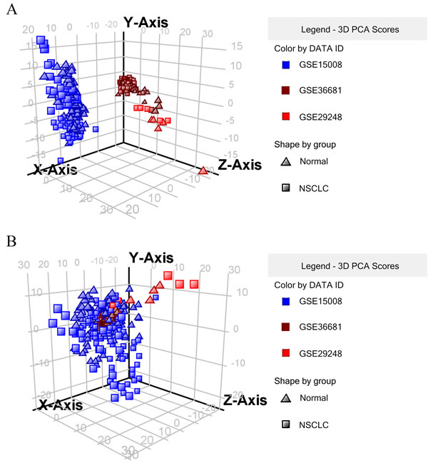 To determine whether the expression of miRNAs could be used to identify NSCLC and control cases, our initial search yielded 19 relevant data sets. After removing 3 duplicated data sets and 11 unqualified data sets (Figure 1), three primary data sets(GSE15008, GSE36681, GSE29248) as a training cohort were further examined in this meta-analysis, which was comprised of a total of 263 cancer tissue samples and 236 control tissue samples. We received another two complete sets of miRNA data (GSE51853, GSE19945) as a validation cohort, which was composed of a total of 127 tissue samples. The five lung cancer microarray data sets was used to used to analyze the miRNA expression profiles of NSCLC tissues relative to their normal controls. The characteristics of these samples are shown (Table 2, Table 4). Microarray data sets were normalized by control normalization algorithm using Agilent’s GeneSpring 13.0. After normalization, batch effect was removed (Figure 2).