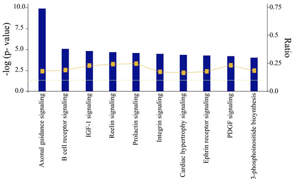 In order to explore these interactions between miRNAs and target genes, we decided to perform a pathway analysis using the list of overlapped target genes referenced by the three computational databases. The top 10 significant pathways enriched 1473 genes associated with cancer initiation and progression.