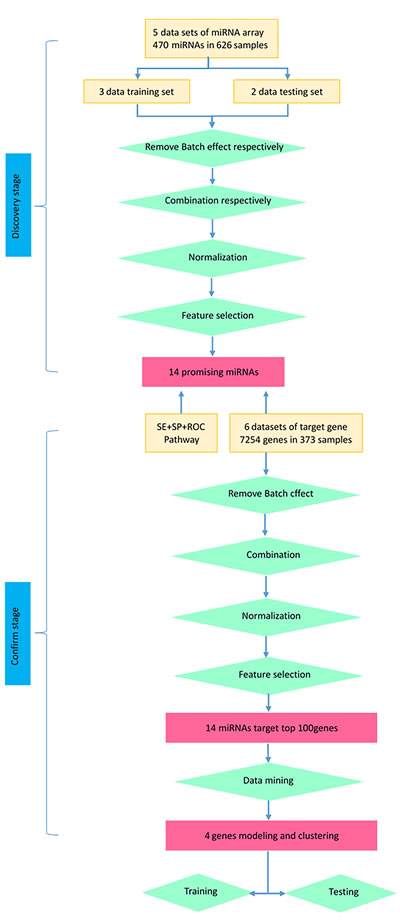 470 overlapped miRNAs were differentially regulated by cancer cases with a cut off p-value of 0.05 and fold change of 1.5. Meanwhile we developed an algorithm based on the Weka tool to construct miRNAs predictive models by data mining; subsequently, we selected 14 miRNAs as a new integrated training set to construct a predictive model.