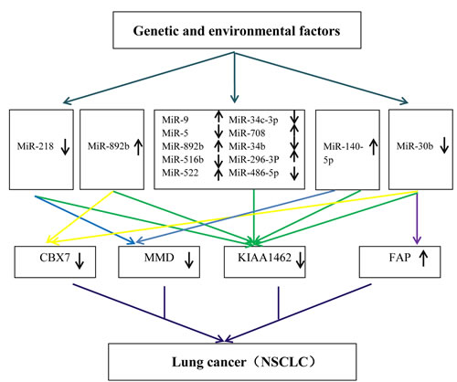 To seek genes offering greater sensitivity and specificity, a statistical model based on six gene data sets was built. Finally, we selected the 4-gene index (KIAA, MMD, CBX7, and FAP) as a novel biomarker for diagnostic prediction of NSCLC. The index achieved 96.7% sensitivity, 88.1% specificity, 89.9% PPV, and 96.0% NPV in the training set, and with higher significance in testing set (SE = 98.7%, SP = 82.4%, PPV = 86.1%, NPV = 98.3%). Emerging reports [27, 40, 41] showed that MMD, CBX7, FAP played an important role in the proliferation of lung cancer [30, 43, 44]. It is noteworthy that the gene KIAA has never been reported as related to cancer, serving only as a risk factor in coronary artery disease [45][42]. Our study showed KIAA was frequently directly or indirectly associated with the 14 promising miRNAs in NSCLC. Therefore, based on both miRNAs and target genes level, we generated a hypothetical model that can explain genetic and environmental factors that trigger NSCLC (Figure 7). Genetic and environmental factors could affect the expression of miR-9, miR-584, miR-708, miR-218, miR-296-3p, miR-30b, miR-522, miR-486-5p, miR-34c-3p, miR-892b, miR-34b, miR-516b, miR-140, miR-592, then that of KIAA, MMD, CBX7, and FAP, and through interaction finally result in tumorigenesis. As illustrated in our experiment, has-miR-9, has-miR-296-3P, and the gene FAP were up-regulated whereas has-miR-522, has-miR-34b, the gene KIAA1462, the gene MMD and the gene CBX7 were down-regulated. The QRT-PCR results were consistent with the microarray meta-analysis results.