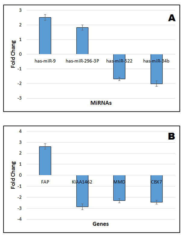 Figure 8: Verification of miRNA and gene expression of integrative microarray results using real time QRT-PCR. A. Verification of 4 miRNA results. B. Verification of 4 gene results. The positive value indicates up-regulated fold change of lung cancer cell line A549 compared to normal lung epithelial cells NL20. The negative value indicates the down-regulated fold change of lung cancer cell line A549 compared to normal lung epithelial cells NL20. Values refer to the mean ± SD of three independent samples, each run in triplicate.