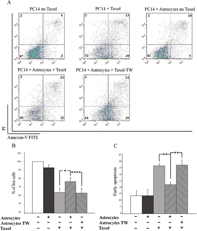 Figure 1: Astrocytes protect PC14 cells from Taxol-induced apoptosis in a contact-dependent manner. The percentages of live and apoptotic cells were determined by FACS analysis (see Materials and Methods section). (A) Representative dot plot of FACS analysis of treated PC14 cells stained with annexin-V FITS and PI. PC14 singlet-cell events are distinguished from target cells by the CD340 specific marker. Numbers in the quadrants are the percentages of PC14 cells within each quadrant. (B, C) Quantitative results of FACS analysis. B. Percentage of live (low PI, low annexin V) PC14 cells cultured alone, with astrocytes, alone plus Taxol, with astrocytes in a contact-dependent manner (mixed co-culture) plus Taxol, and with astrocytes in a contact-independent manner (separated by a transwell membrane (TW)) plus Taxol. Results are expressed as percentages of untreated PC14 cells. C. Apoptotic (high annexin V, low PI) PC14 cells cultured alone, with astrocytes, alone plus Taxol, with astrocytes in a contact-dependent manner plus Taxol, and with astrocytes in a transwell (TW) plus Taxol. The results are expressed as percentage of total cells and are presented as means ± SEM. Analysis (One-way ANOVA) revealed significant differences in live cell percentages and apoptotic cells between annexin V-stained and PI-stained cells, P < 0.05. Post-hoc analysis was performed by Fisher’s LSD: *P < 0.05, **P = 0.01, ****P < 0.0001; n = 4.