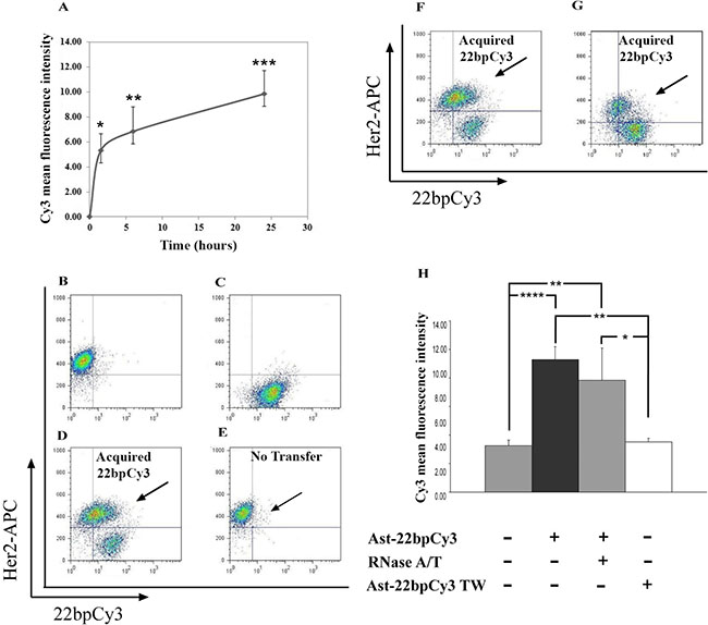 To examine the transfer time course of the tagged synthetic sRNA, PC14 cells (4 × 105) were co-cultured with astrocytes-22bpCy3 (2.5 × 105) in a 6-well plate at 37°C, for 1.5 h, 6 h, or 24 h. At the end of the co-culturing the PC14 cells were stained with APC anti-human CD340 Ab to label PC14 cells, and analyzed for 22bpCy3 acquisition by FACS as described above.