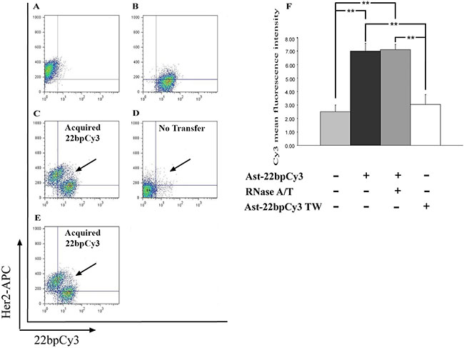 Figure 3: Cy3-tagged 22-bp oligonucleotides are transferred from astrocytes to MDA-MB-231 cells. Astrocytes-22bpCy3 were co-cultured with MDA-MB-231 cells for 6 h. MDA-MB-231 cells (CD340 positive) containing 22bpCy3 were assayed by FACS analysis (see Materials and Methods section). (A−E) Representative dot plots of the results of FACS analysis after the different treatments, depicting total live-cell gate records A. MDA-MB-231 cells (positive for CD340) alone. B. 22bpCy3-transfected astrocytes (Cy3-positive) alone. C, D. MDA-MB-231 cells co-cultured with astrocytes-22bpCy3 in a contact-dependent (C) or contact-independent (transwell, TW) manner (D). E. MDA-MB-231 cells co-cultured with astrocytes-22bpCy3 treated with RNase A/T. (F) Quantitative results of the FACS analysis, expressed as MFI of 22bpCy3 recorded in the MDA-MB-231 cells and presented as means ± SEM. Analysis (One-way ANOVA) revealed significant differences in MFI of 22bpCy3 between the groups: P < 0.01. Post-hoc analysis by Fisher’s LSD yielded **P < 0.01; n = 5.