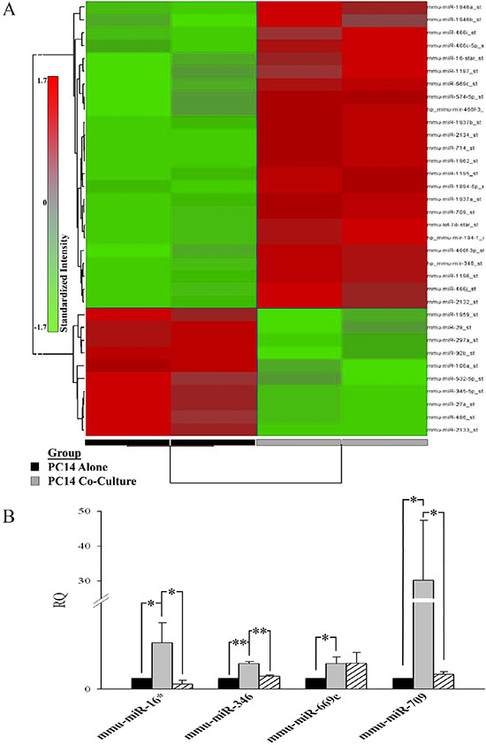 The miRNA microarray reveals a significant increase in levels of 20 sRNAs in PC14 cells co-cultured for 6 h with astrocytes in a contact-dependent manner (mixed cultures) compared to PC14 cells cultured for 6 h in the absence of astrocytes (P < 0.05 by t-test: fold-change (FC) difference ≥ 1.7).