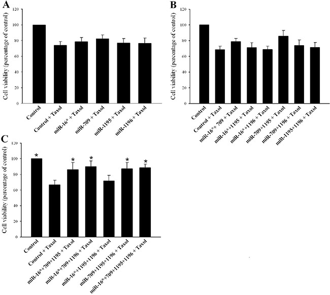 Figure 6: Combined enforced expression of miR-709 with two other sRNAs protects PC14 cells from Taxol-induced toxicity. (A, B) Transfection with one or two sRNAs did not increase cell viability compared with control cells transfected with either mimic negative control or empty miR-Vec plasmid or both. (C) Transfection with miRNA-709 in combination with two sRNAs or all four sRNAs significantly increased cell viability compared to controls. Results are presented as means ± SEM. Analysis (One-way ANOVA) revealed significant differences between the groups: P < 0.05. Post-hoc analysis by Fisher’s LSD yielded *P < 0.05; vv = 5.