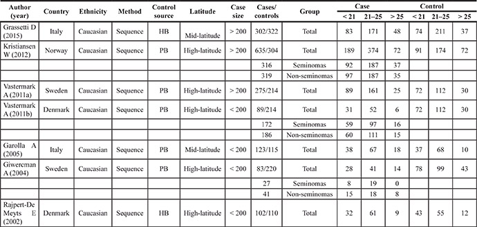 Information on the enrolled studies is shown in Tables 1 and 2, including: (I) the first author’s name; (II) year of publication; (III) country or region of origin, ethnicity, and method; (IV) number of cases and controls. Two authors (WJ Jiang and SM Liu) of the study extracted the information independently and screened the citations that met the inclusion criteria. The discrepancies were adjudicated via discussions until a consensus was reached.