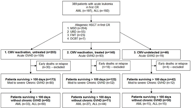 Table 1: Baseline characteristics of the entire acute leukemia patients divided in accordance of the degree of the post-HSCT CMV reactivation and preemptive antiviral treatments