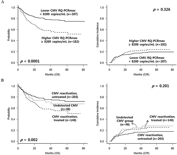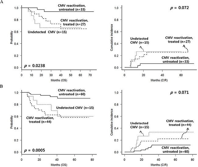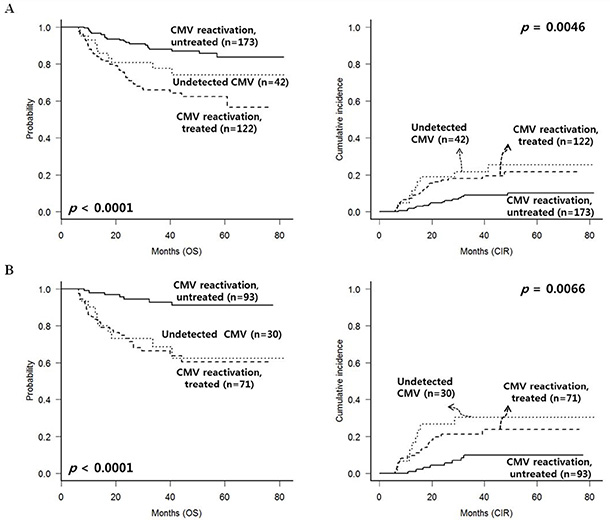 Similarly, we analyzed the outcomes in each subgroup of AML (n = 75) and ALL (n = 119) after excluding early events and cGVHD. In the AML subgroup (Figure 4A), untreated CMV reactivated group showed the most favorable OS (p = 0.024) and lower CIR rate (p = 0.072). In the ALL subgroup (Figure 4B), untreated CMV reactivated group also showed favorable OS (p < 0.001) with lower CIR rate (p = 0.071).