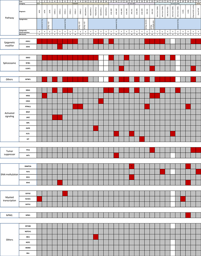 We performed amplicon-based next-generation sequencing (NGS) targeting the coding regions of a panel of 28 genes implicated in myeloid neoplasms using MiSeq platform (Illumina, San Diego, CA) on archived DNA extracted from fresh bone marrow aspirate samples. We used 250 ng of DNA to prepare the genomic library. The genes included in this panel are as follows: ABL1, ASXL1, BRAF, DNMT3A, FGFR, EZH2, FLT3, GATA1, GATA2, HRAS, IDH1, IDH2, IKZF2, JAK2, KIT, KRAS, MDM2, MLL, MPL, MYD88, NOTCH1, NPM1, NRAS, PTPN11, RUNX1, TET2, TP53, and WT1. Following successful library generation and purification, equal quantities of DNA from each sample were used for multiplex paired-end sequencing on MiSeq personal genome sequencer using the MiSeq Reagent Kit v2 (500 cycles). Human genome build 19 (hg19) was used as the reference for sequence alignment. MiSeq Reporter Software 2.2 and Integrative Genomics Viewer (IGV) were used for variant calling and visualization respectively. Successful sequencing was indicated by a Q30 score of more than 85%. For this study, variants with more than 5% allelic frequency with a minimum coverage of 250X in both directions were included. Since matched normal tissue was not tested, data from literature and COSMIC database was used to infer somatic nature. Single nucleotide polymorphisms listed in dbSNP 137 and 138 and 10K genome project were excluded. The functional significance of all variants was analyzed using PolyPhen-2 website (http://genetics.bwh.harvard.edu/pph2/); only variants that resulted in “probably damaging” were included. Selected variants were confirmed using an alternate platform, such as Sanger sequencing, pyrosequencing or capillary electrophoresis (data not shown). Mutation analyses of 5 additional genes that are not included in the NGS panel (SETBP1, CEBPA, MDM4, and splicing factor genes SRSF2, SF3B1 and U2AF1) were performed by Sanger sequencing. In 25 cases, FLT3 mutational analysis for internal tandem duplication was also performed by capillary electrophoresis.